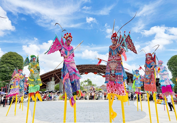 马山壮族会鼓震撼开场,醒狮登高送祝福,鲁沙尔社火高跷惊艳四座……10月1日上午11时许,南宁园博园里热闹非凡,马山壮族会鼓、醒狮、高跷、川剧变脸、长嘴壶茶艺等非遗表演吸引了众多游客驻足观看,掌声、欢呼声不断。现场最吸引人的是来自青海省西宁市鲁沙尔高跷艺术协会带来的高跷表演,高跷跷身平均高2.8米、最高达3.6米。艺术家们按鼓点脚踩高跷,扭着身段,祈福国泰民安,展现“中国高跷之最”的非凡风采。