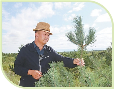 内蒙古通辽市科尔沁左翼后旗“双百万亩”项目区,朝克吐正在查看樟子松嫁接红松的长势情况。 |