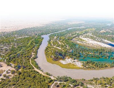 新疆巴音郭楞蒙古自治州尉犁县塔克拉玛干沙漠边缘,塔里木河蜿蜒流淌,两岸胡杨生机勃勃。 |