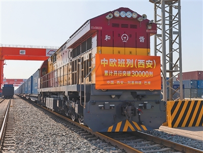 陕西省西安市,满载光伏组件的中欧班列从西安国际港站驶出。 |