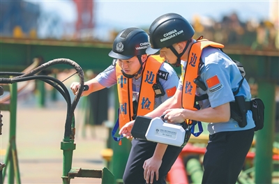 10月6日,福建省福州市连江经济开发区华电码头,福州边检站民警坚守岗位,使用检测仪器检查安全情况。 谢贵明摄(人民视觉) |