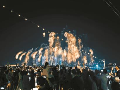 昨天,游客在“爱达·魔都号”邮轮甲板上欣赏“吴淞口空中剧场”无人机烟花秀。 爱达邮轮供图