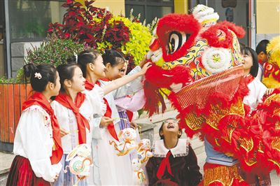 9月28日,呼和浩特市玉泉区清泉街小学表演舞狮的学生和同学们欢乐互动。中秋佳节将至,该校开展了“品味中秋民俗 传承节日文化”主题活动。活动中,同学们在老师的耐心指导下,学习制作月饼、拼装传统花灯、捏制兔儿爷等传统技艺,大家通过沉浸式体验中秋习俗,深度感受中华优秀传统文化的独特魅力。记者 王磊摄
