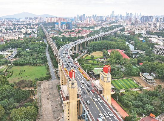 南京长江大桥上车流如织,迎来假日车辆出行高