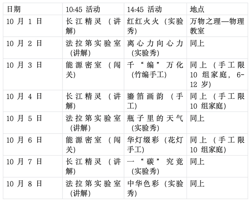 科学实验秀(序厅,14:00开始,免费):10.1/3“能量爆发”、10.2/4“四季科学”、10.5/7“力学世界”、10.6/8“自然之旅”;