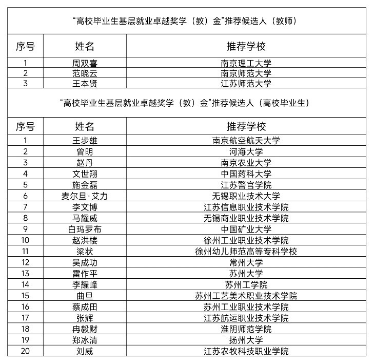 9月30日,江苏省教育厅发布公示。根据中国教育发展基金会《关于开展2024—2025年度“高校毕业生基层就业卓越奖学(教)金”推荐工作的通知》要求,经学校推荐、资格审查、专家评审,拟推荐南京理工大学周双喜等3人作为“基层就业卓越奖学(教)金”教师候选人,南京航空航天大学王步雄等20人作为“高校毕业生基层就业卓越奖学(教)金”高校毕业生候选人,现将遴选结果予以公示。公示时间2025年10月1日—10月14日。