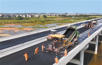 10月4日,江西省吉安市永丰县佐龙乡香山村,工人在绕城公路建设现场加紧摊铺柏油路面。 刘浩军摄(影像中国) |